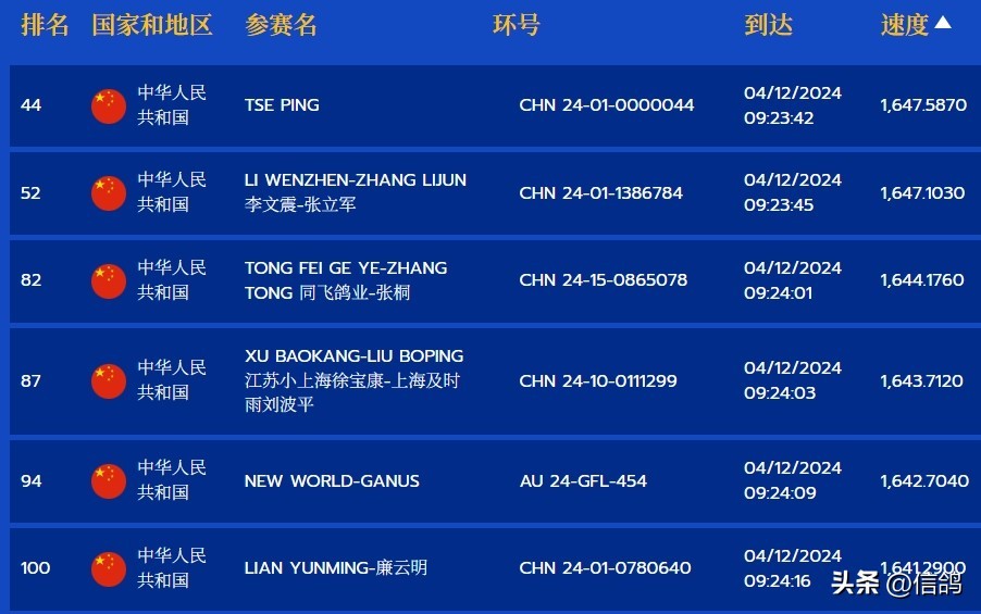 中国鸽友今年参赛热情空前高涨,共计871羽赛鸽参赛,比去年激增近一倍。在第一关比赛中,中国赛鸽表现不俗,共有6羽入围前100名。其中,谢炳名下的CHN24-01-0000044赛鸽排名最高,位列第44名;小上海的CHN24-10-0111299赛鸽也跻身前100名,取得第87名的佳绩。