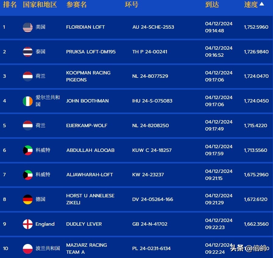 而荷兰鸽界传奇考夫曼的“NL 24-8077529”号赛鸽以1724.04米/分夺得季军,再度彰显了欧洲鸽界的强大竞争力。此外,荷兰另一位名家爱亚卡普的赛鸽位列第五。