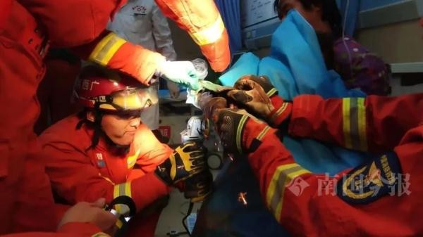 了解情况后,消防救援人员决定立即对绞肉机进行破拆。他们利用电动圆盘锯和角磨机,对绞肉机外壳进行切割,并用生理盐水冷却切割部位,避免高温对女童手部造成二次伤害。经过近20分钟的紧张救援,消防救援人员成功将绞肉机机身切割成两段,将转轴及刀片拆下,女童的手被成功取出。随后,现场医生立即对女童进行紧急救治。