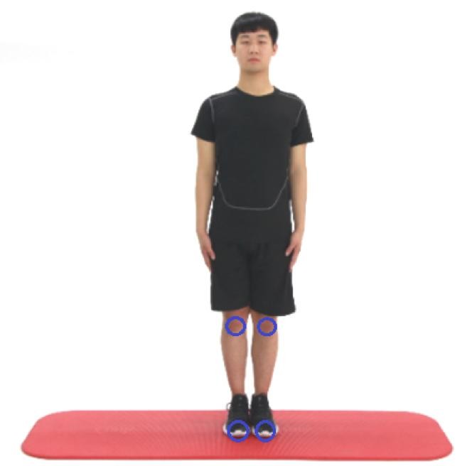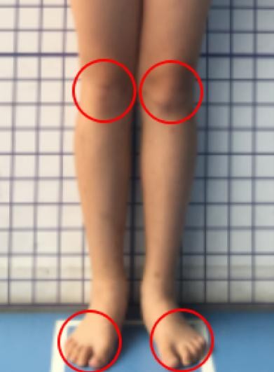 正常情况下,膝关节朝向正前方时,足尖也朝向正前方,不发生左右的偏移,即脚跟与第二脚趾的连线,与矢状轴不形成夹角;