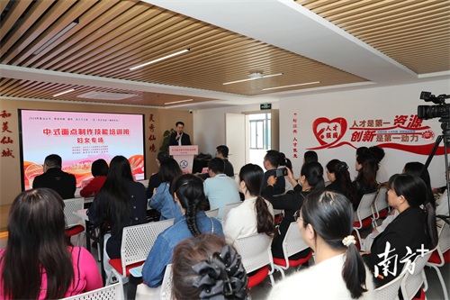 本次活动邀请广东省技术能手、汕头技师学院烹饪系教师林珊为仙城镇乡村妇女劳动力开展中式面点制作技能培训。林珊从潮汕饮食文化出发,讲解基础理论知识、烹饪技巧以及食材搭配等实用技能,还现场教授了“椰蓉糯米糍”“荷兰薯粿”等中式面点制作技能。