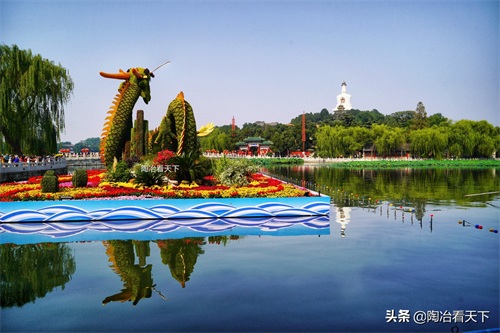 尤其值得一提的是,在今年国庆期间,北海公园还搭建了“龙腾盛世”大型水上花坛。以白塔为背景的荷花湖中,一条祥龙盘旋出水,飞腾于青山绿水之间,非常壮观,很适合在此拍照留念。