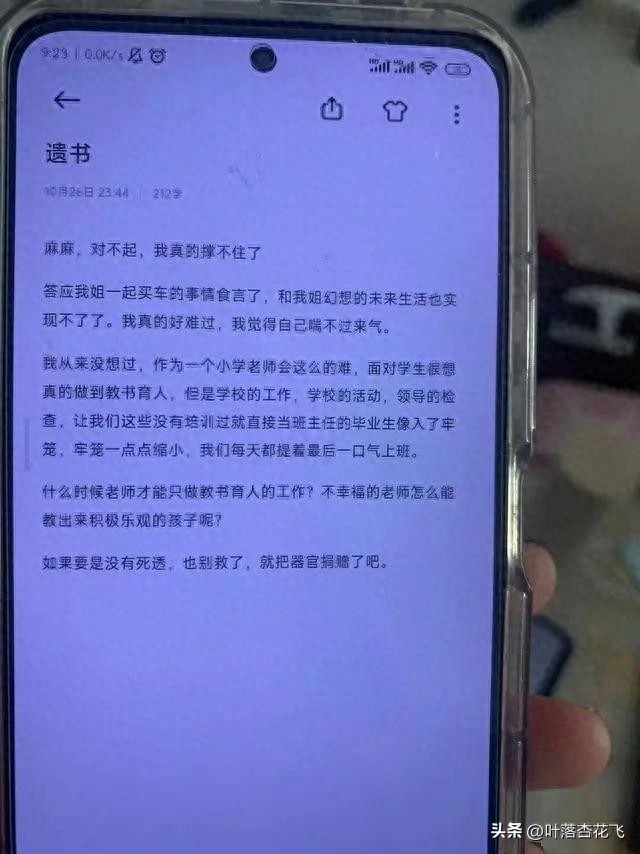 记者注意到,她在遗书中还表示,“面对学生,很想真的做到教书育人,但是学校的工作,学校的活动,领导的检查,让我们这些没有培训过就直接当班主任的毕业生像入了牢笼,牢笼一点点缩小,我们每天都提着最后一口气上班。什么时候老师才能只做教书育人的工作?不幸福的老师怎么能教出来积极乐观的孩子呢?”