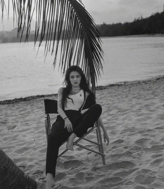 还有一张换成黑白底色,徐璐光着脚丫,显得休闲惬意,又飒又爽,像是落日黄昏下的意景。