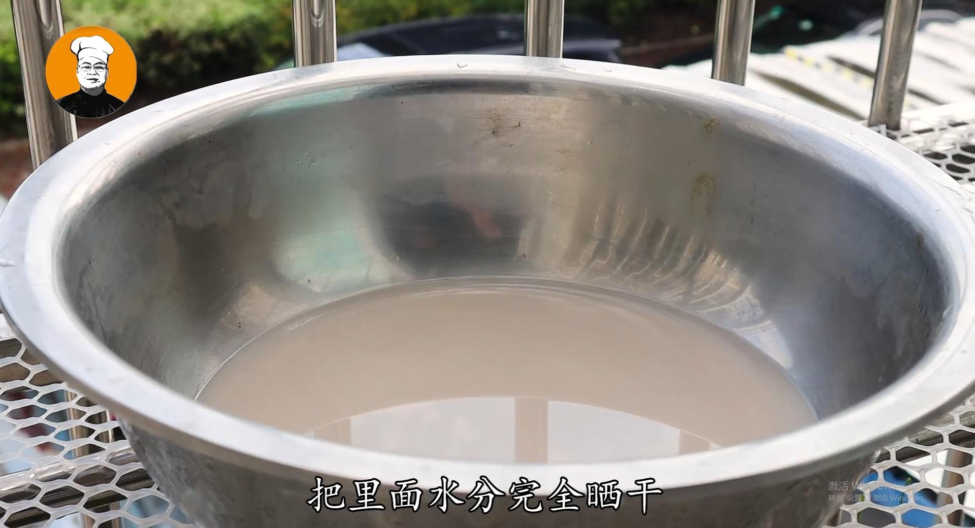 6、放在阴凉的地方,静置五个小时以上。时间到时,把上面的一层水倒掉。剩下的沉淀物,摆在太阳底下,暴晒三天左右。时间倒时,把做好的藕粉放在碗中
