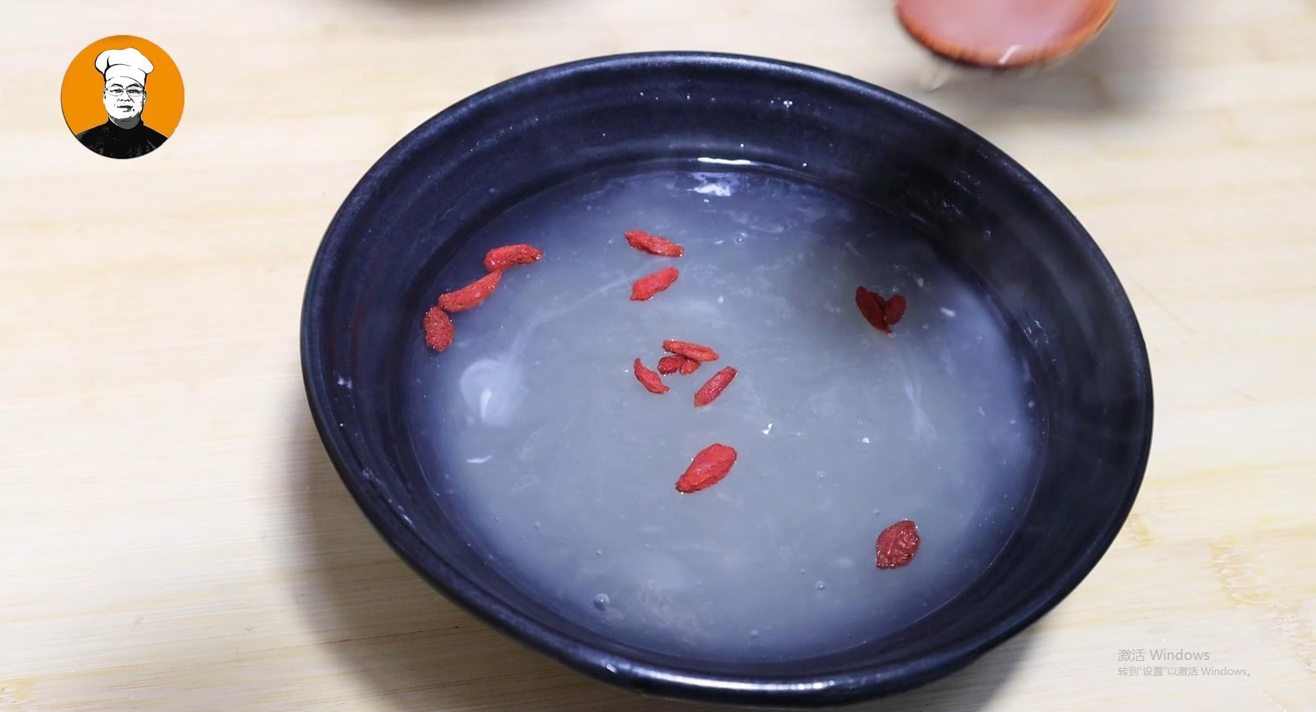 7、先用凉水把藕粉化开,喜欢吃甜的还可放入两勺白糖,搅匀。再用开水冲泡,一边冲一边搅,冲好以后放入几粒枸杞,藕粉就做好了