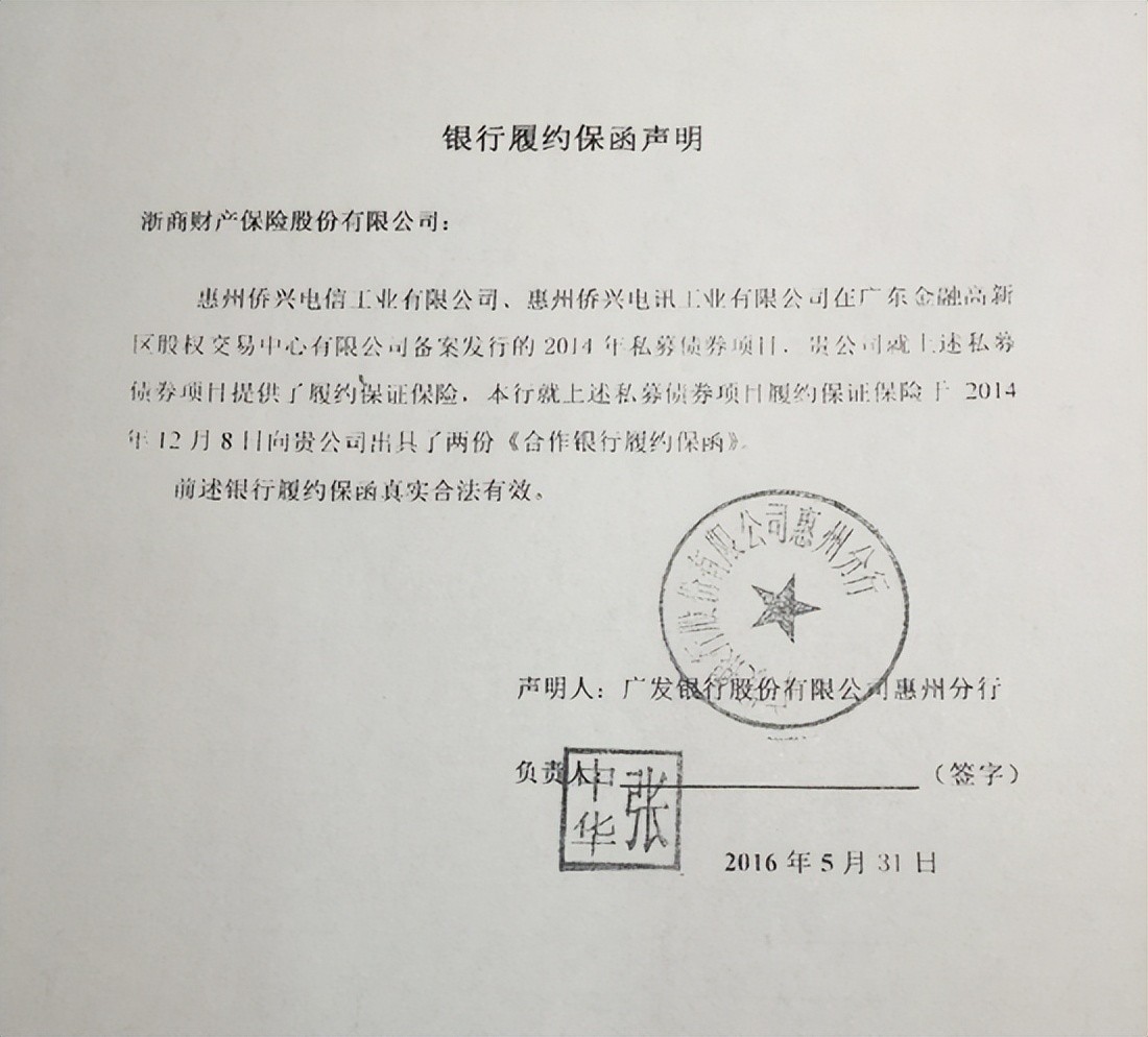 2014年,中国企业500强侨兴集团旗下的侨兴电讯、侨兴电信在广东金融高撕区股权交易中心备案后,在蚂蚁金服旗下的招财宝平台各发行了5亿元的私募债,本息共计11.46亿元。其中,浙商银行承保了这两个标的的信用保证保险,广发银行做信用担保。而到了 2016年12月15日,本该到期的产品却并没有进行本息兑付,侨兴电讯、侨兴电信因资金周转困难,无法还款。而在同年12月23日,广发银行惠州分行表示,浙商财险的保函是不法分子假冒广发银行伪造的!