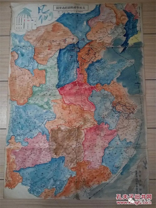 日本侵华史料,1938年《周报》附录 《支那事变第一年战斗经过图》, 内阁印刷局印刷发行。1938年6月下旬状况,日军占领地区北京、河北省、山东省、山西省等,日军轰炸地点示意图 中国军阵地 中国船舶交通遮断区域线,日军进攻经, 国军阵地、集结地图等标注。 尺寸:73*51.2CM。据了解,1945年日军投降后,曾大规模焚烧在华地图资料。这份经过多年岁月能完好保存下来的日军侵华地图,成为日军侵华不容质疑的历史见证。