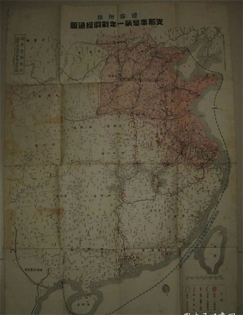 1938年 日本侵华之史证《支那事变战斗经过要图 》。73x51cm。陆军新闻班、海军省海军军事普及部制图,内阁印刷局发行,该图记录了至1938年6月下旬日军侵略进军路线、日军占领区和重点轰炸地点以及我军集结区和抗日阵地等。