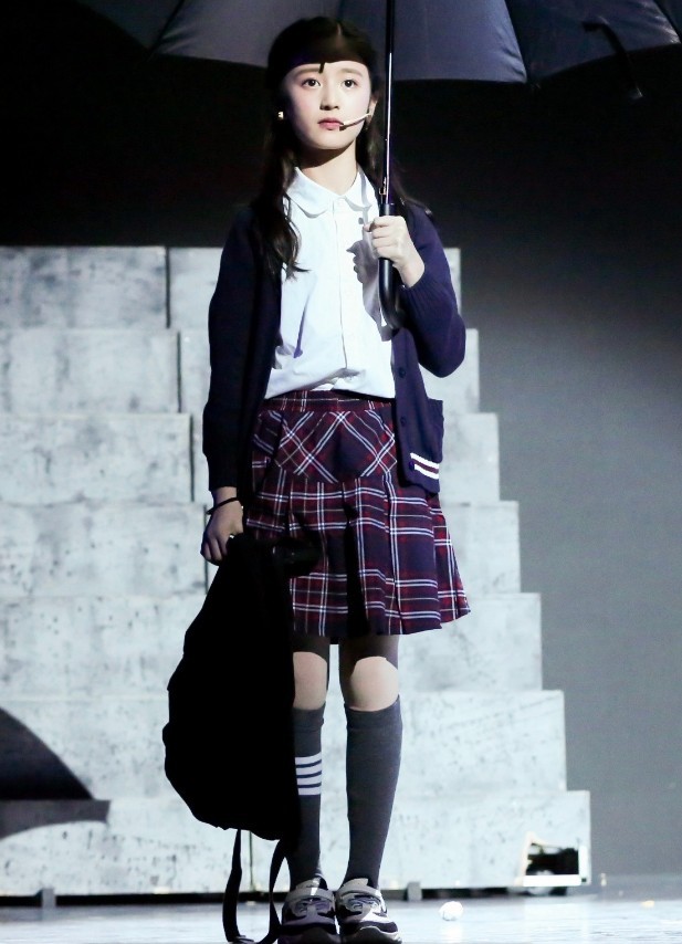她身穿的这套穿搭很简单干净,上身穿了一件深蓝色的开衫外套,整洁干净的外套很清新,内搭白色的衬衫更是凸显了简约大方的气质,搭配一条格纹的半身裙,这样的搭配,9岁太成熟。