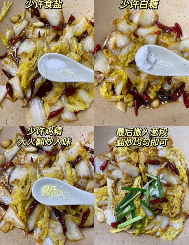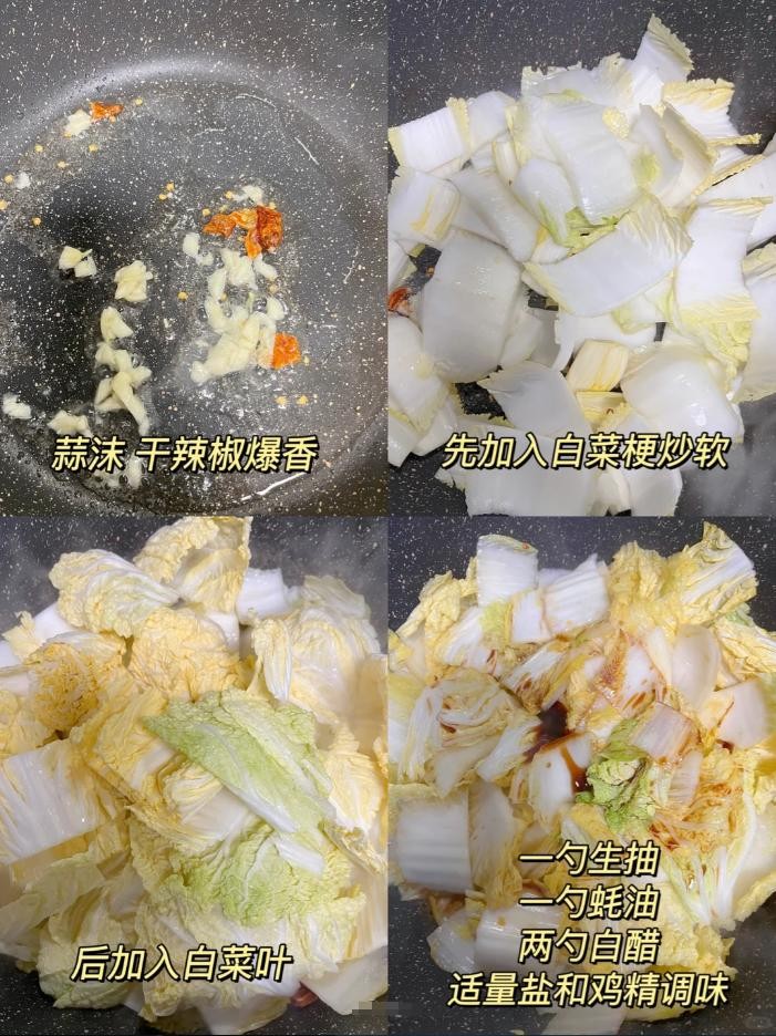 材料:白菜、蒜末、干辣椒、生抽、醋、盐、糖、淀粉、食用油