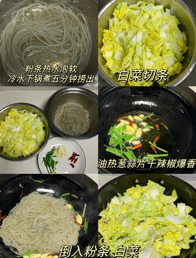 材料:白菜、粉条、五花肉、葱姜、盐、鸡精、食用油