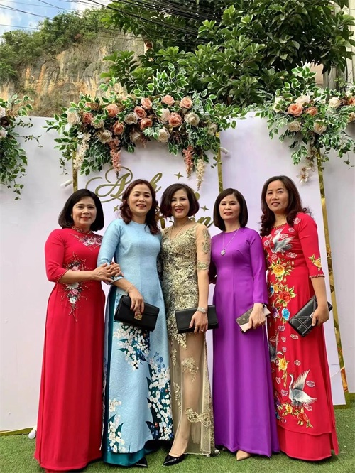 越南的婚礼一般穿两套衣服,一套婚纱,一套奥黛,婚礼上的奥黛颜色款式五花八门,而且分分钟有种可以拍时装大片的感觉,百花争艳,下面几张是我大嫂贵妇女团提供的照片