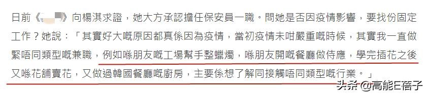 面对港媒的采访,杨淇大方承认担任保安员一职。并表示疫情发生后,她其实做过餐厅服务员、学完插花后去花铺卖花、还做过韩国餐厅的厨师。