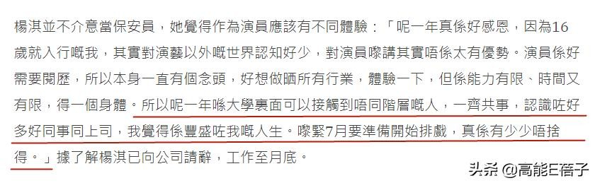 而知情人告知港媒她已经去大学的保安,并穿起保安员制服在大学校园内巡逻。得知此消息后,港媒去采访了杨淇,她也亲口承认了此事,表示自己已经做了一年保安,让港媒大为震惊。虽然杨淇没有大红大紫,但是演技颇受认可。