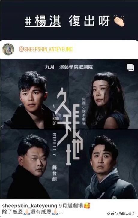 原来,现年36岁的杨淇,近一年甚少现身幕前,直到最近她才在社交平台上分享即将出演舞台剧《久天长地》的喜讯。
