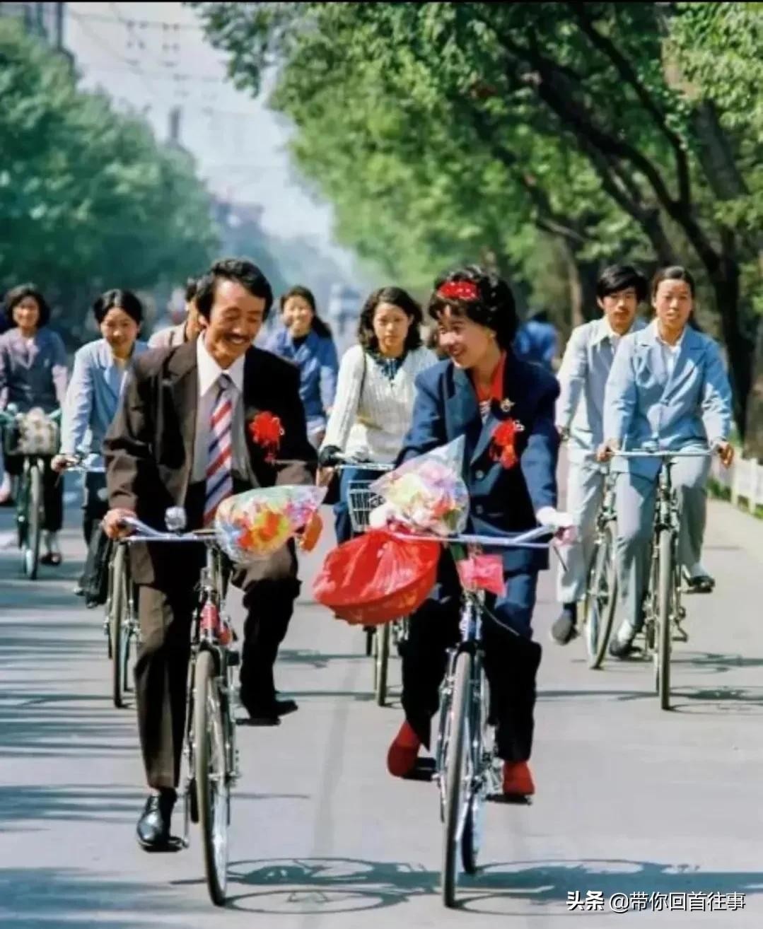 10.1984年,沈阳街头,一对新婚夫妻的留影。照片中的新郎,虽然面相上长的有点着急,但一身西装外加一台凤凰自行车显得也有几分英俊;至于新娘子,长相秀美,一辆凤凰在手,看着新郎心里说不出的美。那时车马慢,一生只够爱一人。你要有这想法,可就拉倒吧。不论其他,单论这两辆自行车在当时的总价便要接近400元。什么概念呢?那时候一个普通工人的工资不过20-30元而已。