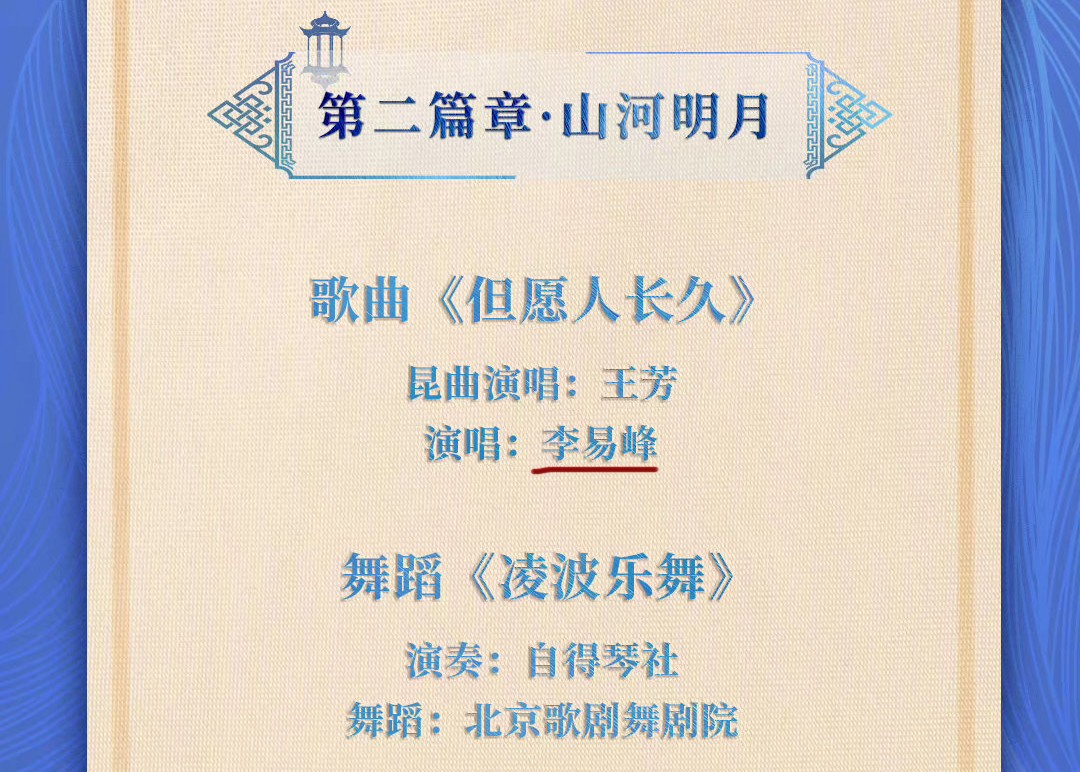 9月10日这天,我中午去看央视公布的中秋晚会节目单时,李易峰的名字还在。出现在第二篇章“山河明月”之《但愿人长久》这个节目中,据说他还是以苏式戏服设计师的身份出演。