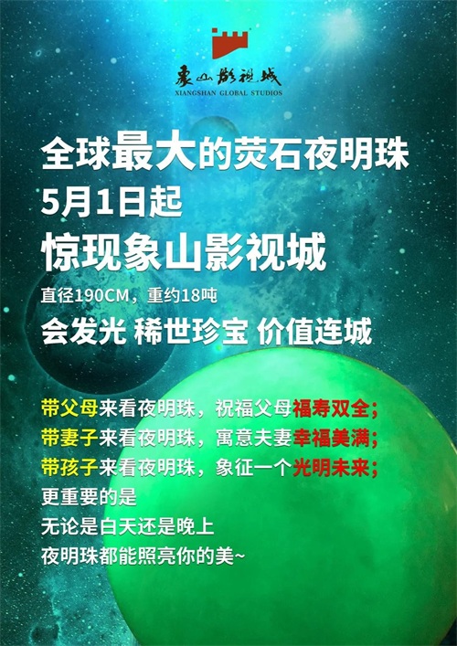 走在民国城观赏重宝是种什么样的体验?来象山影视城立刻让你有画面感!本次影视狂欢季将在象山影视城民国城的北方四合院夜明珠场馆陈列全球最大的夜明珠:玉石重18吨左右、直径1.9米左右,需3人才能合抱。