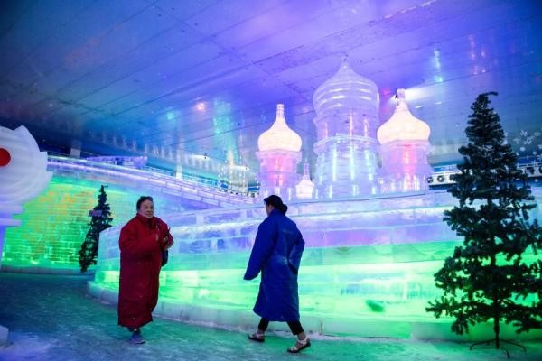 8月18日,游客在长沙极地馆冰雕艺术展示区游览。