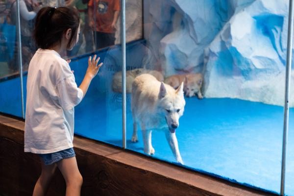 8月18日,在长沙极地馆,游客在观看北极狼。