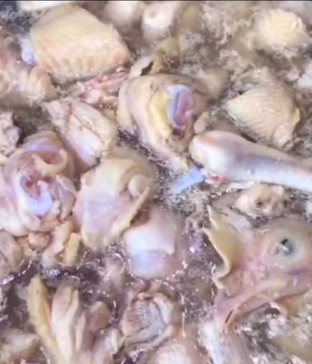 剁好的鸡肉下锅淖水,捞出浮沫,加点料酒去腥