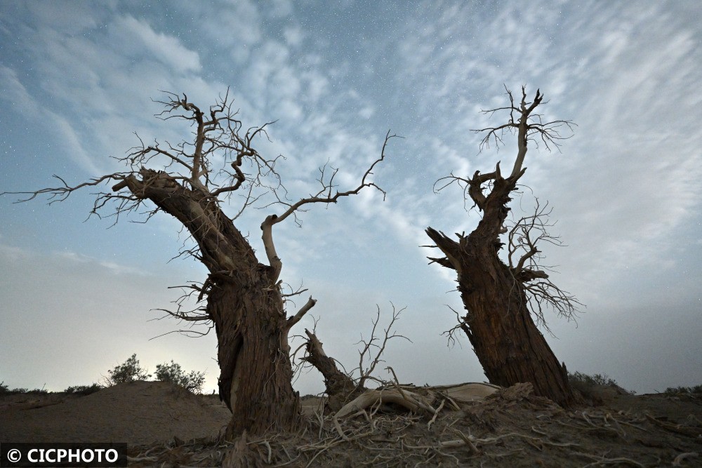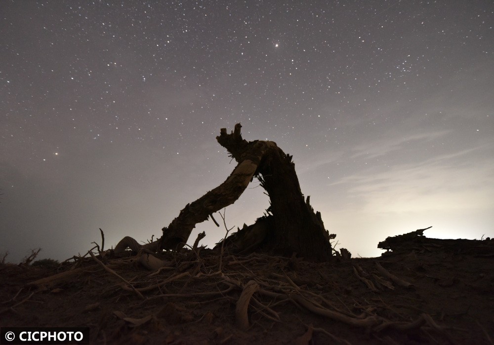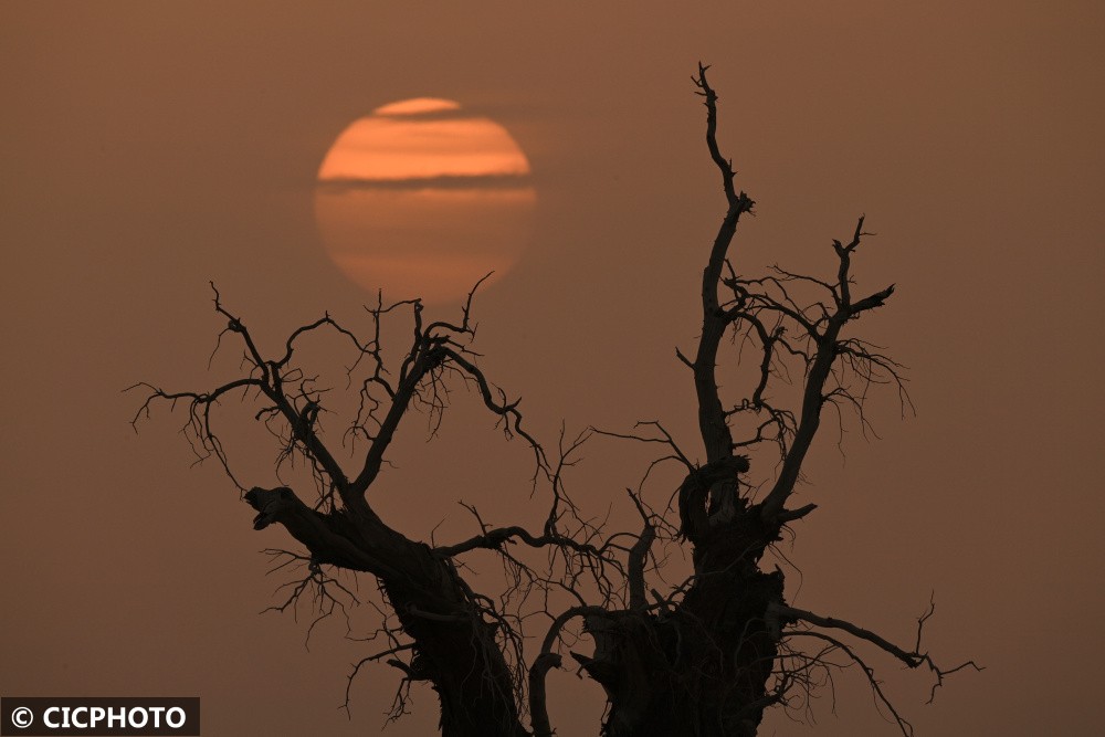 夏至时节,新疆维吾尔自治区塔里木盆地出现晴好天气,千年沧桑胡杨与星空、日出相互映衬,呈现出沧桑壮美景象。胡杨是第三纪残余的古老树种,由于它具有惊人的抗干旱御风沙耐盐碱的能力,能顽强生存繁衍于沙漠之中,也被誉为“沙漠英雄树”,更有着“生而不死一千年,死而不倒一千年,倒而不朽一千年”的美誉。