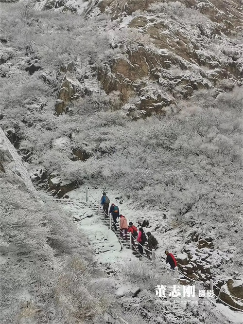 12月1日凌晨,西海岸小珠山景区迎来了今冬的第一场雪。早晨六七点钟,雪花越下越大,洋洋洒洒,玉树琼枝、粉雕玉琢,于错落有致的雪色群山中,于层层叠叠的青石板阶上,天地一色,苍苍茫茫……行走其间,仿佛令人置身于无瑕的仙境,迷人的雪景让游客流连忘返。( “青岛观”摄影师 董志刚 徐跃学/摄 )
