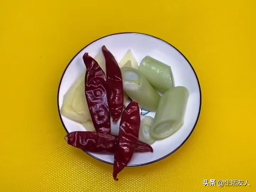 第二步:把葱清洗干净切成段,生姜切成姜片,切好后放入一个小碟子里,碟子里再放入4个干辣椒、1个八角备用。