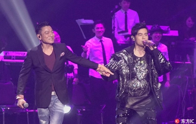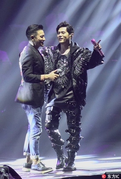 两个时代的天王世纪大同框,合体献唱《忘情水》、《浪子心声》等经典歌曲,周董还现场为华仔表演乐魔术。