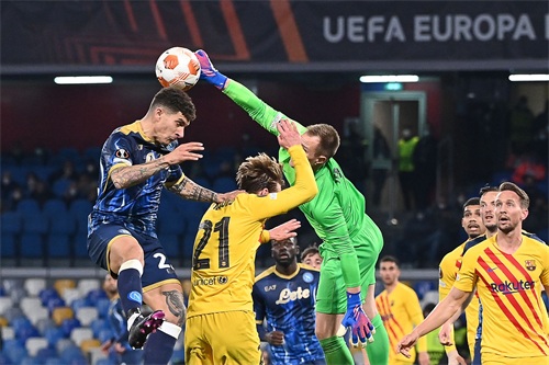 2月24日,那不勒斯队球员迪洛伦佐(左)与巴塞罗那队门将特尔施特根拼抢。 新华社/法新