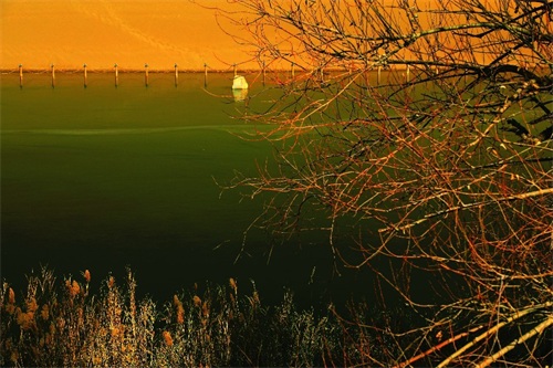在碧绿的泉水边上!一丛微光,却使得格外养眼!干巴巴的树枝,似乎是冬眠了呢,可是芦苇花却还在低低矮矮地闪耀着!