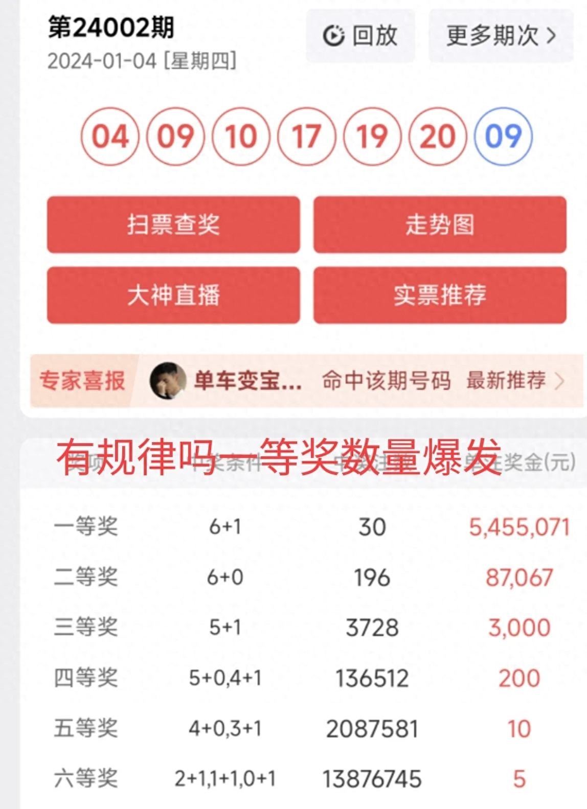 24002期规律清晰简单,感觉有大神提前猜出,所以本期一等奖数爆发达到30注,每注5455071元。希望大家一起探讨研究,我不是预言帝,我数学功力也不够,算不错下一期开奖号码,总结近期基本规律。祝所有阅读本篇文章的、点评转该文章的抱得大奖,24年健康发大财。#双色球分析##购彩小技巧分享##彩票有规律吗##花钱自由#