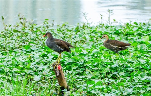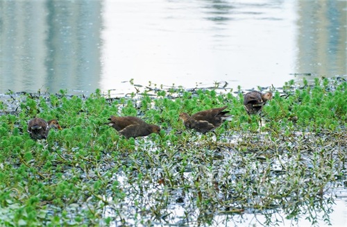 极目新闻记者发现,靠近团结大道武汉火车站一侧的湖边,活跃着一群黑水鸡亚成鸟,它们在鸡妈妈的带领下,在浅水区的水草丛中自由觅食,即使有人从旁边经过,它们也似乎并未受到惊吓而跑远。