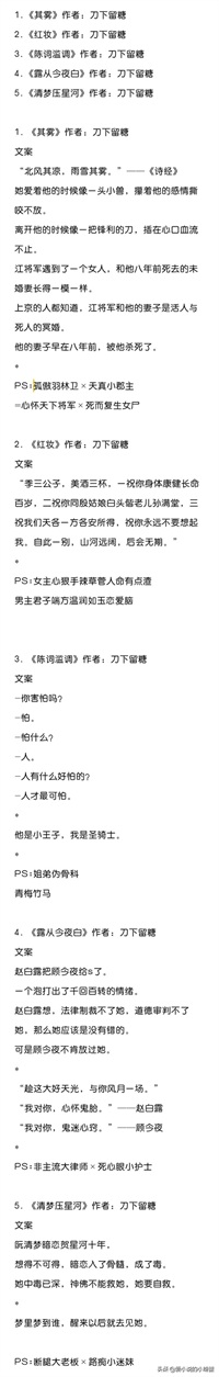 刀下留糖大大还是蛮多有名的破文呀,《露从今夜白》《红妆》……等等,真的不要太棒!