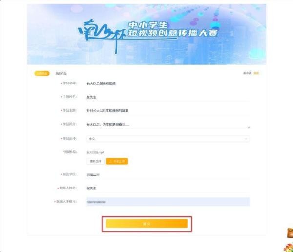 填写作品信息,上传作品视频,点击“提交”按钮,即可完成作品上传。