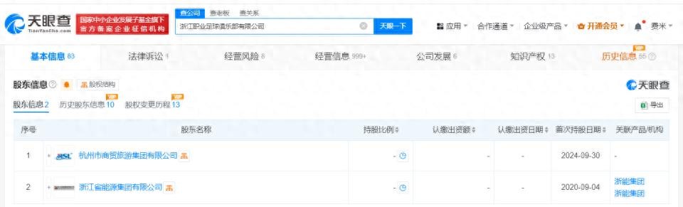 天眼查App显示,近日,浙江职业足球俱乐部有限公司发生工商变更,原股东绿城房地产集团有限公司退出,新增杭州市商贸旅游集团有限公司为股东,张亚东卸任法定代表人、董事长,由沈晓宇接任,同时多位高管发生变更。