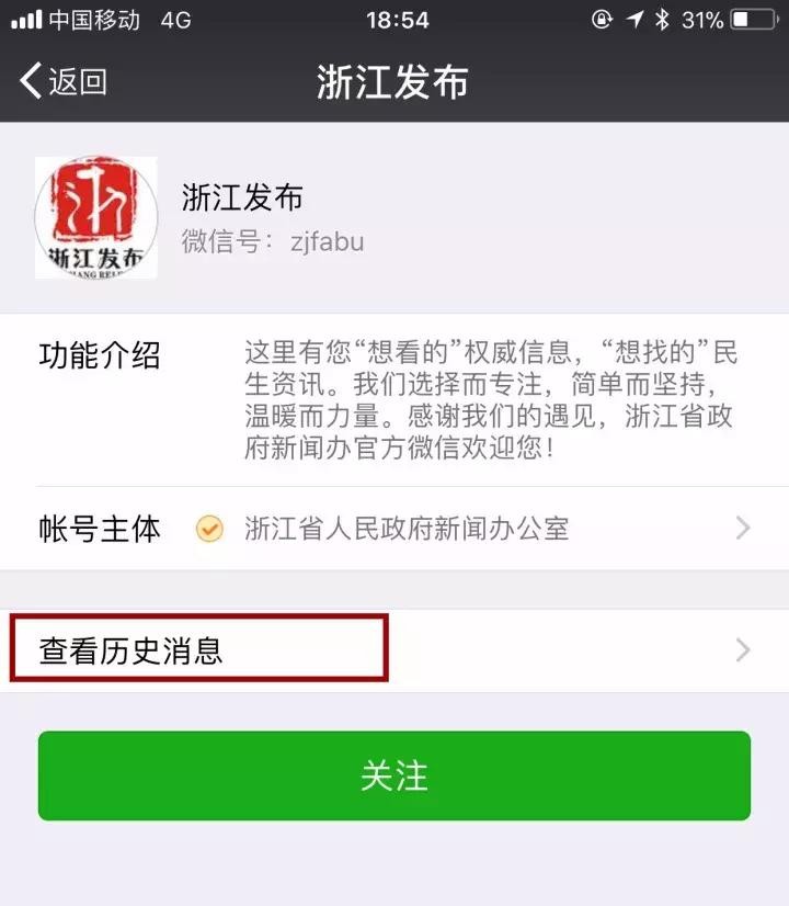 1、搜索浙江发布微信公众号,点击查看历史消息。