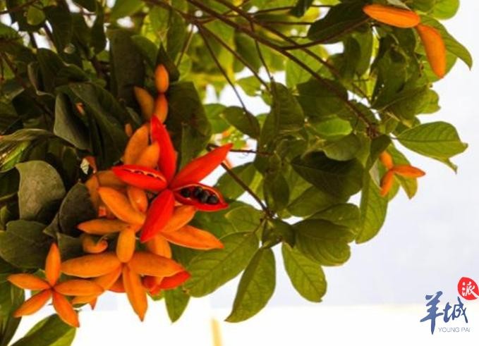 绚丽的红果像一群红蝴蝶飞舞在绿树上,假苹婆成为广州街头的一道亮丽风景线。