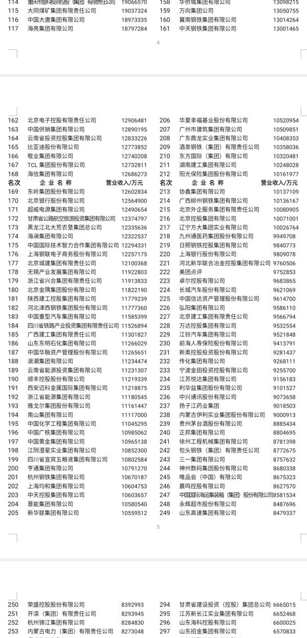 中国石油化工集团有限公司以2.81万亿元营收位居榜首,国家电网有限公司、中国石油天然气集团有限公司分别以2.65万亿元、2.62万亿元营收列第二、三名。其中,河南能源化工集团有限公司以1807.4亿元的营收位列河南第一,排名第122位。