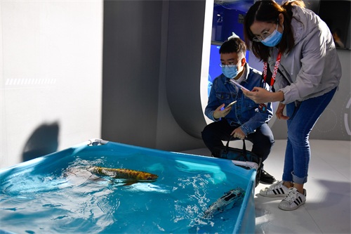 10月19日,观众在观摩水中“游动”的仿生鱼。 新华社记者 黄宗治 摄