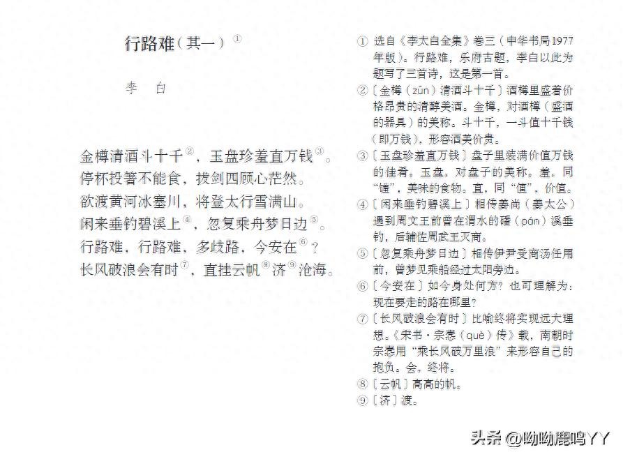 1. 《行路难·其一》是唐代诗人李白的代表作之一,通过层层迭迭的感情起伏变化,不仅显示了诗人对政治现实的强烈不满和内心的苦闷,同时也突出表现了诗人的倔强、自信和对理想的执着追求,展示了诗人力图从苦闷中挣脱出来的强大精神力量。