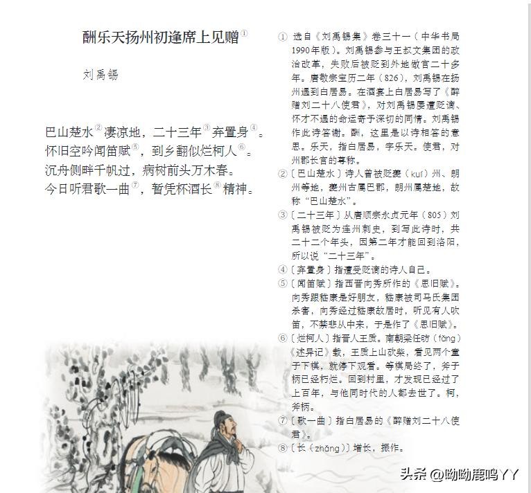 2.《酬乐天扬州初逢席上见赠》是唐代诗人刘禹锡创作的一首七言律诗,这首诗以其深沉的情感和豁达的胸怀,展现了诗人在面对人生逆境时的坚定信念和乐观精神。