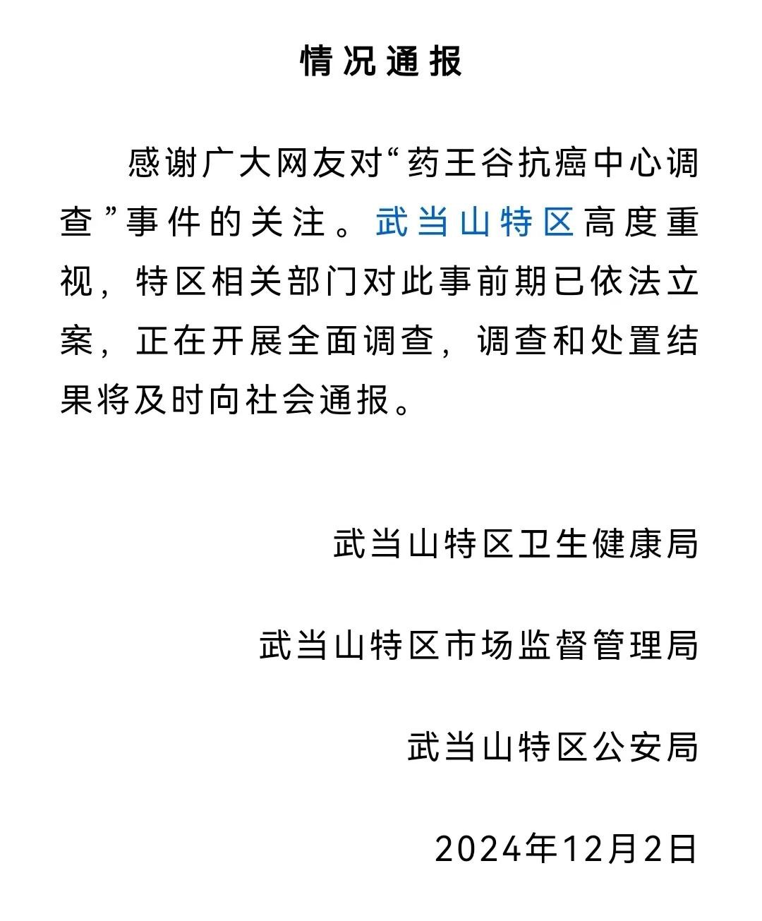 相关部门已对武当山特区药王谷中医馆展开全面调查,案件正在加紧侦办中。
