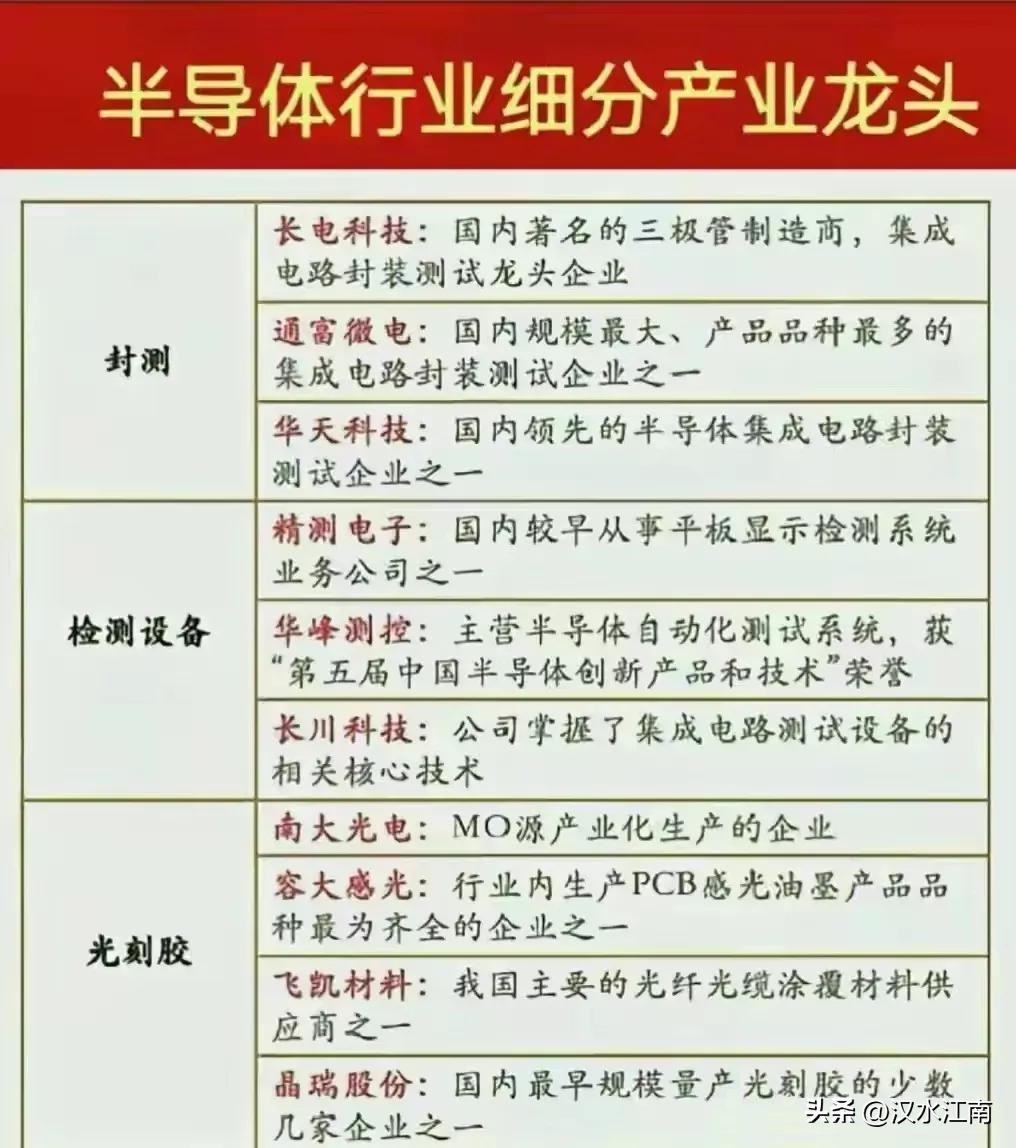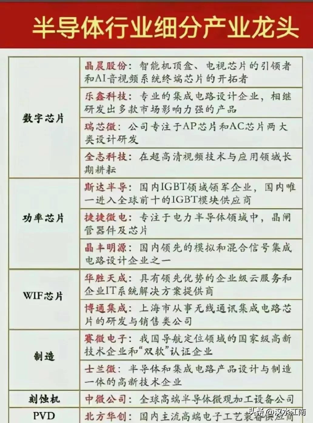 半导体细分龙头股+创业板上市公司龙头汇总+华为代理概念股