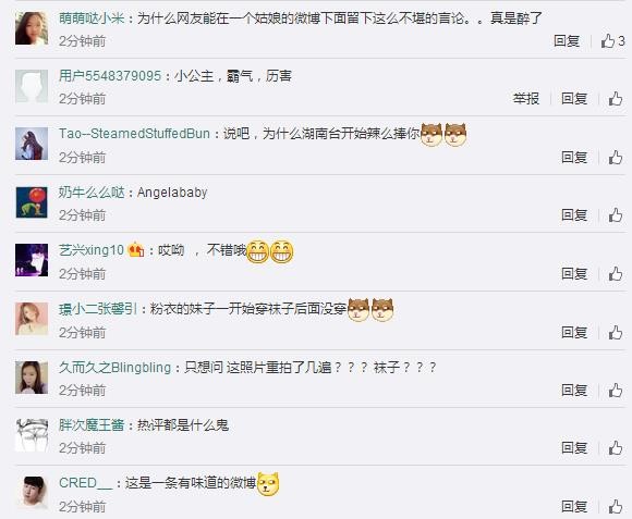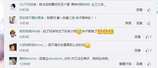 只是,网友的眼光也是雪亮的,貌似除了关注到大长腿意外,网友还关注到了另外的东西。“说吧,为什么湖南台开始辣么捧你”、“粉衣的妹子一开始穿袜子后面没穿”、“只想问 这照片重拍了几遍??? 袜子???”、“我想问 第一张第二张 袜子哪来的!!”、“拍了好多张试了好多次吧,袜子都脱了”