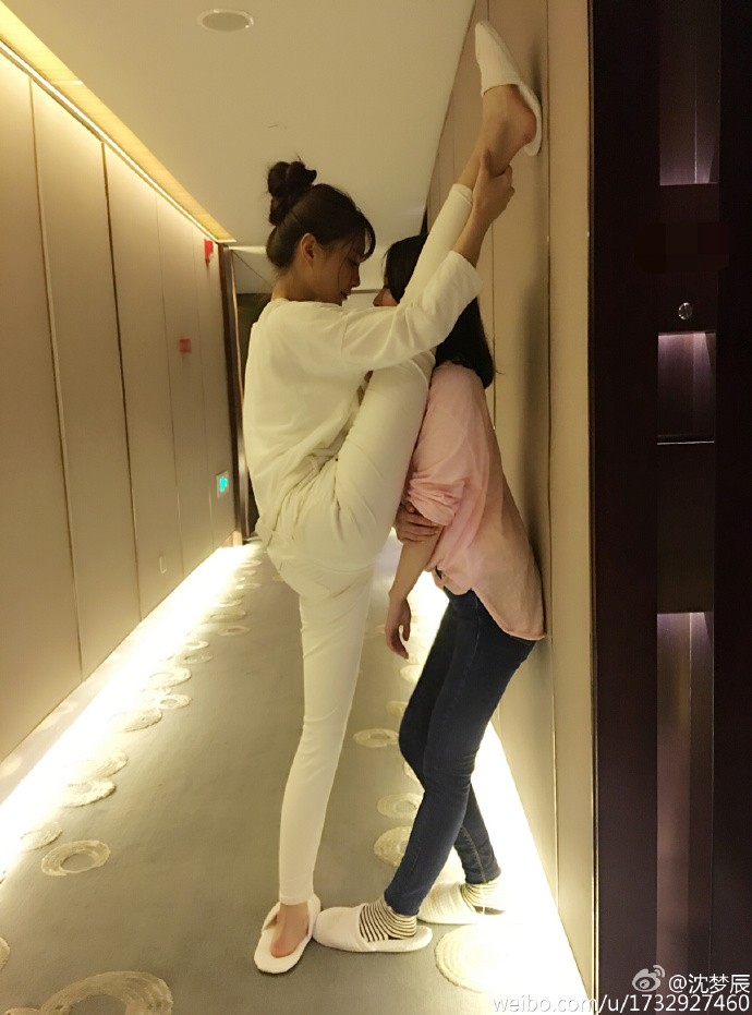 沈梦辰在微博是啊出一组劈腿壁咚好友的搞怪照片,照片中沈梦辰在墙上劈一字马,尽显长腿,手摸好友下巴攻气十足,高清大图,大家感受一下这大长腿!