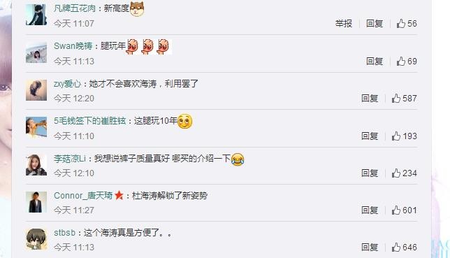 网友也纷纷留言高呼“姿势不错”、“新高度”,“我想说裤子质量真好 哪买的介绍一下”、“这个海涛真是方便了。。”、“杜海涛解锁了新姿势”。。。小编表示内心纯洁,不懂网友的内涵意思,哈哈,大家感受一下。