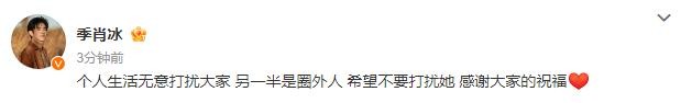 搜狐娱乐讯 11月7日,演员季肖冰发文承认已婚,并表示另一半是圈外人,希望大家不要打扰她,并感谢大家对自己小家庭的祝福。