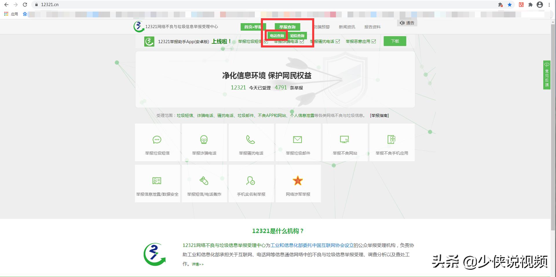 8、返回打开12321网络不良与垃圾信息举报受理中心网站:https://www.12321.cn/,在最顶端找到举报查询-电话查询点进去: